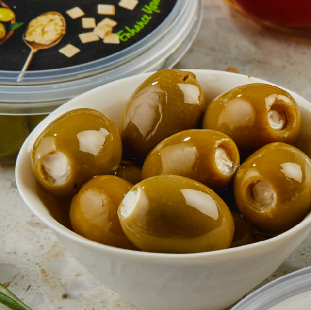 Huge green olives, selected for their taste and texture are individually hand-stuffed by our dedicated team to produce a special range of taste sensations. Our olives are stuffed with feta, with semi-dried tomatoes, with anchovies or with chilli to give you the very best of Mediterranean flavours in one bite!